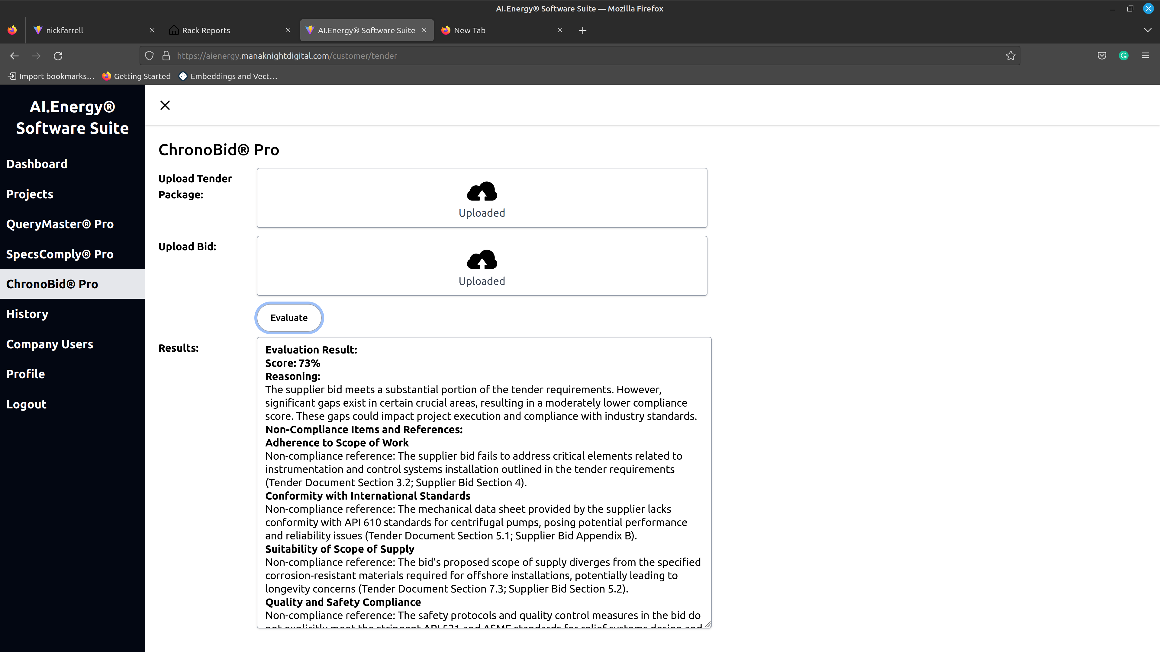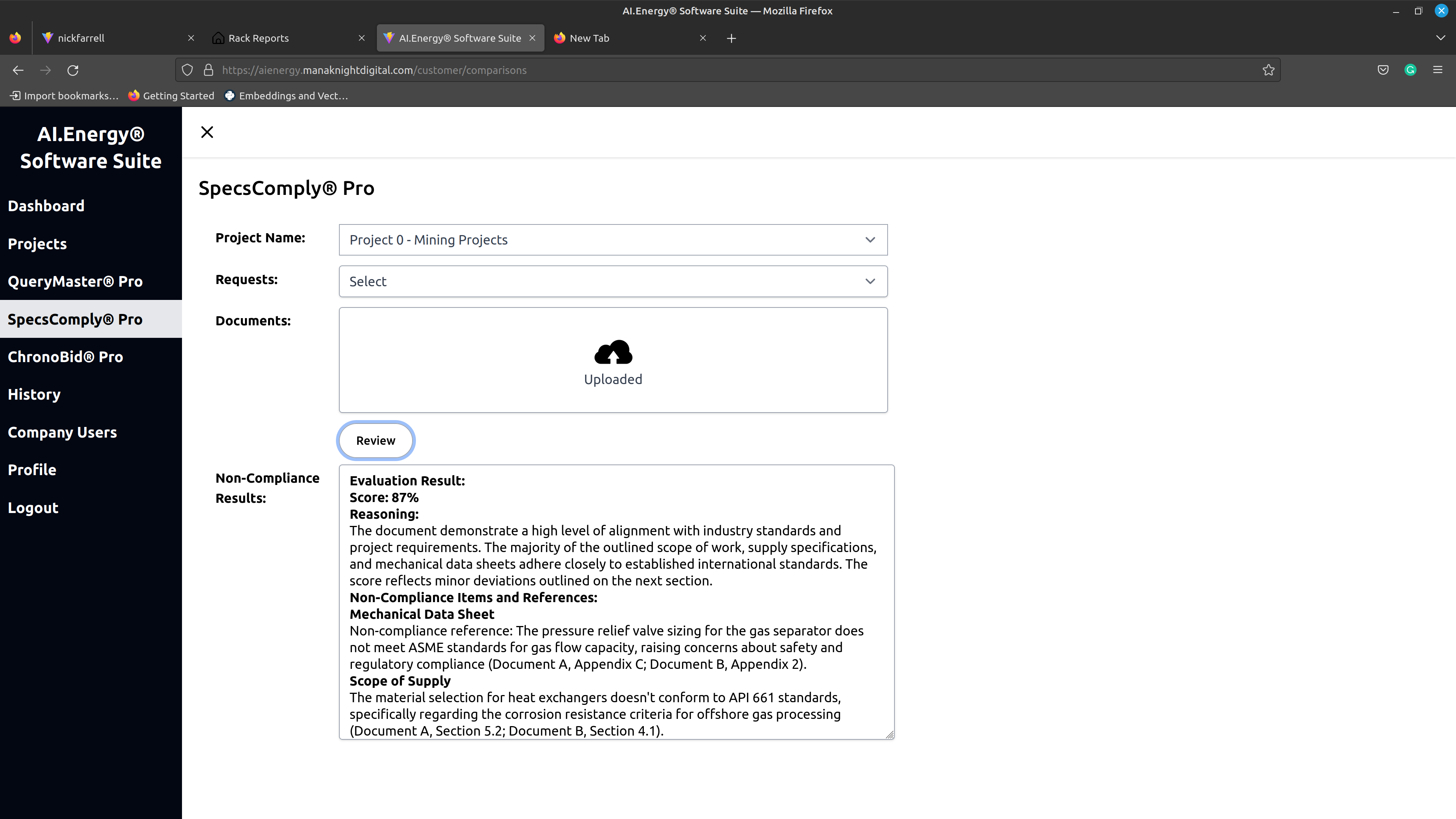 Our document processing suite (AI Energy) is designed to streamline and enhance various aspects of project management and compliance. With a suite of powerful tools, we empower organizations to effortlessly manage project documentation, ensure compliance with standards and regulations, and make informed decisions based on comprehensive analysis.